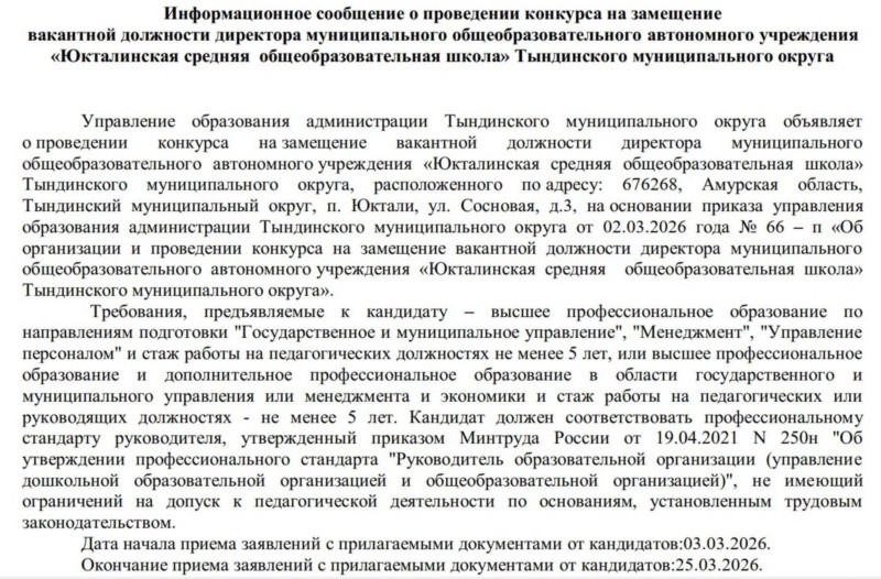 Информационное сообщение о проведении конкурса на замещение вакантной должности директора муниципального общеобразовательного автономного учреждения «Юкталинская средняя общеобразовательная школа» Тындинского муниципального округа